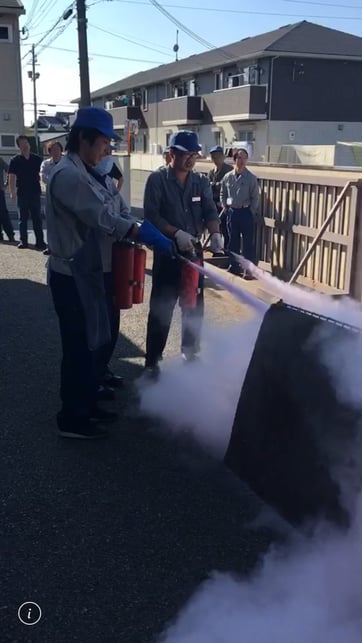 今年の防災訓練は新人3人による消火器取り扱い講習。